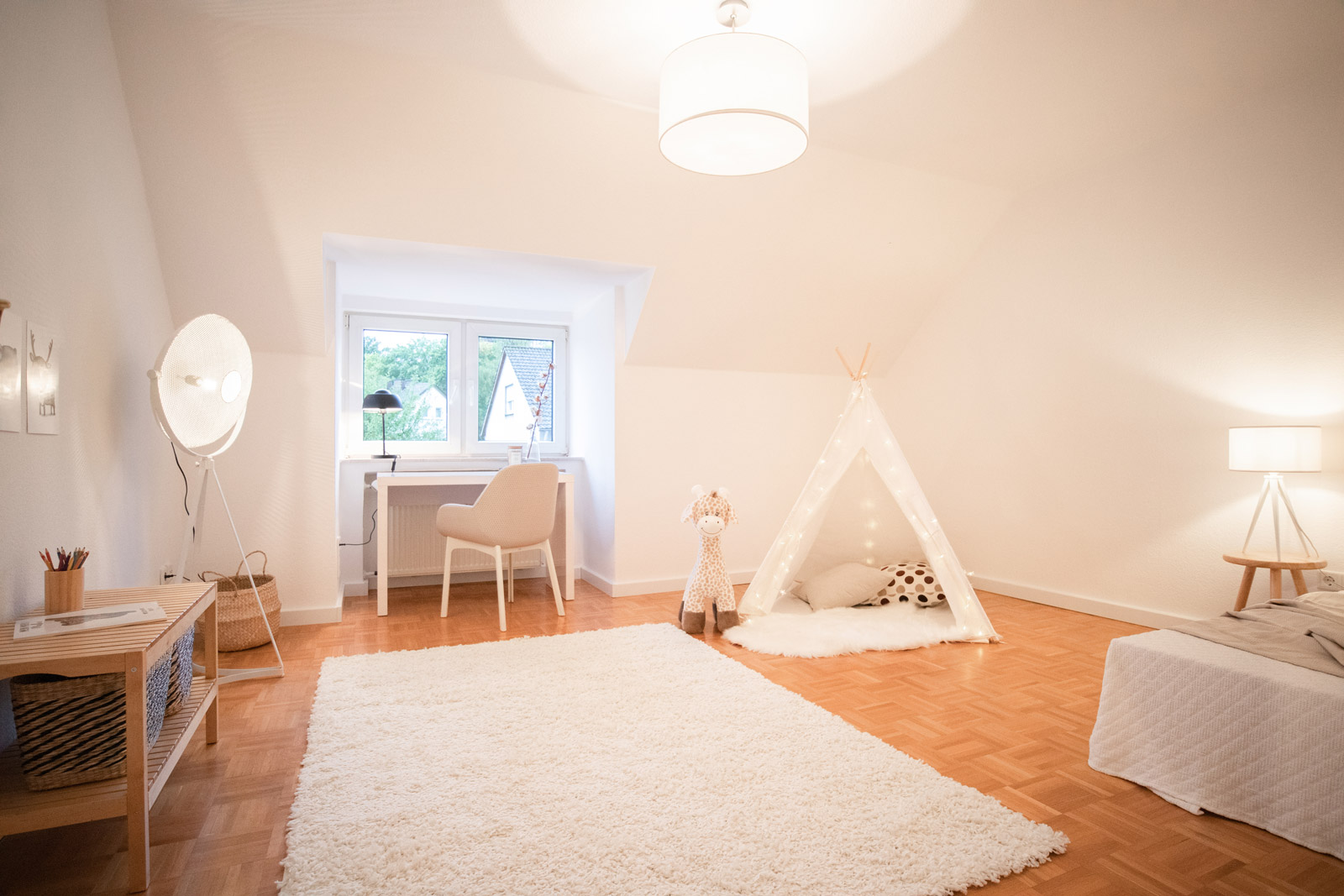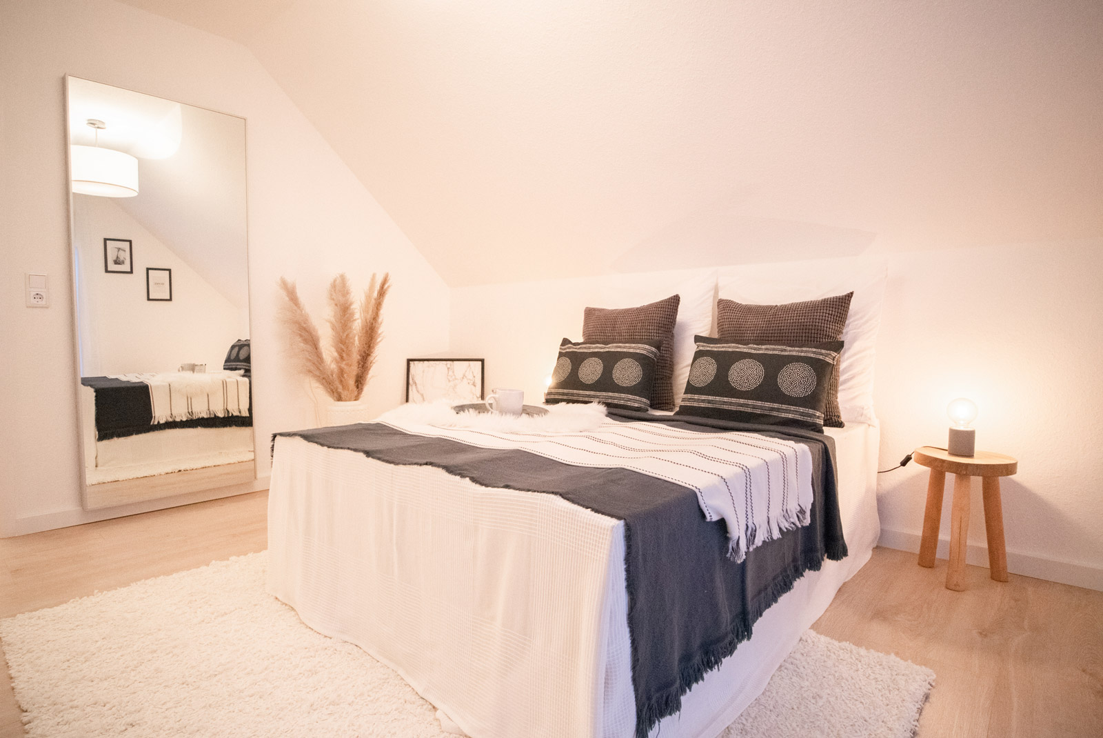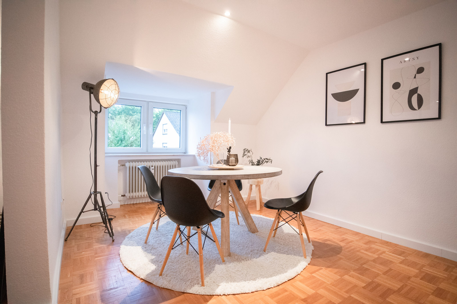 Die vielen Schrägen und die geringe Stehhöhe der Gauben würde es Interessenten nicht leicht machen, ein wohliges Raumgefühl zu bekommen. Als Immobilienprofi wusste unser Kunde, dass wir durch Home Staging das volle Potenzial der Räume aufzeigen können. Durch die harmonische Einrichtung schafften wir eine Orientierung und zeigten Interessenten damit Möglichkeiten zur smarten Raumnutzung. Sowohl Kunde als auch Interessenten waren restlos begeistert vom neuen Look der Immobilie.
